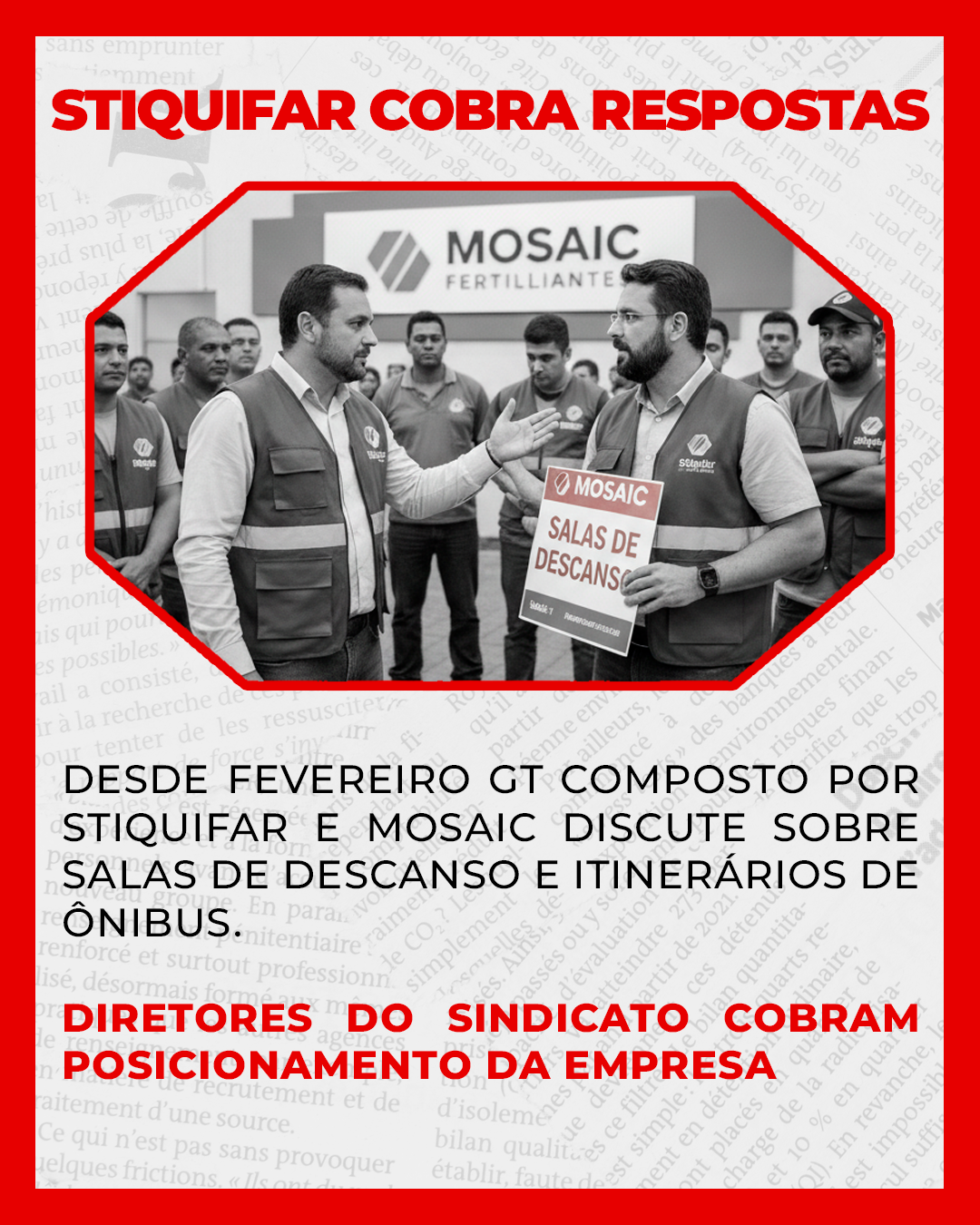 Depois da celebração do Acordo Coletivo referente ao Turno 4×4 e FGH, houve a constituição de um Grupo de Trabalho composto por representantes do Stiquifar e da Mosaic. Isto ocorreu ainda no mês de fevereiro, com o objetivo de discutir temas de interesse mútuo, entre eles as condições das salas de descanso e os itinerários dos ônibus, considerando o tempo excessivo de exposição a que os trabalhadores estão submetidos. “Até hoje não saiu do papel”, afirma o diretor Fernando Dimas.