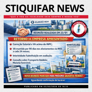 O STIQUIFAR informa que, na reunião realizada com a Diretoria e o setor de Recursos Humanos da EuroChem, no dia 23 de janeiro, a empresa se comprometeu a apresentar uma proposta consolidada para apreciação em assembleia.